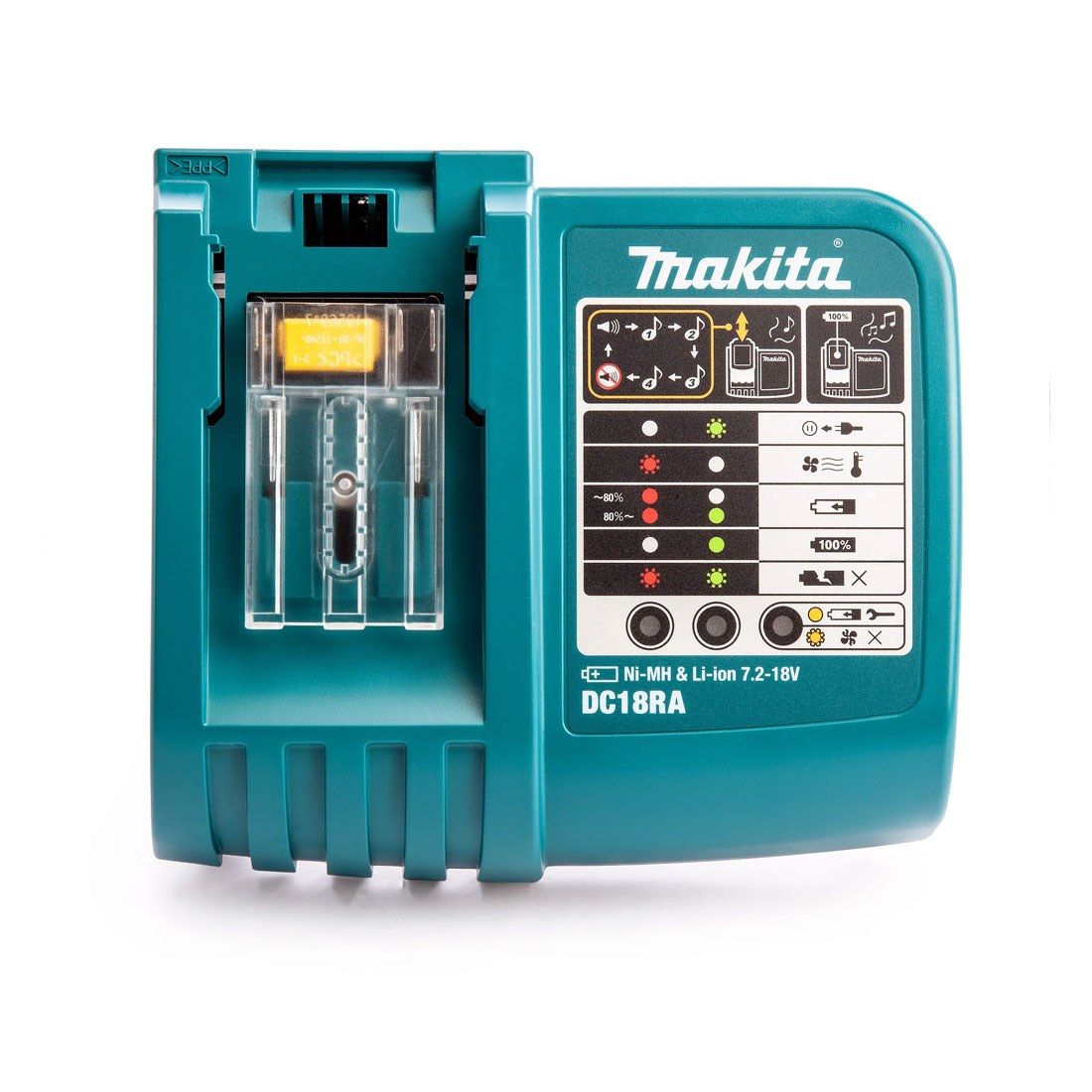 Always 100% genuine Makita 240v fast battery charger. The Makita DC18RA Li-ion 14.4 / 18v LXT Battery Charger uses a built-in central processing unit to communicate with each battery via their built in memory chip during each charge cycle. This analyses the data stored in the battery chip to decide on the best charging method each time. This innovative technology from Makita results in longer lasting batteries. The DC18RA charges a BL1850B 18v LXT 5.0Ah lithium-ion battery in approximately 45 minutes.