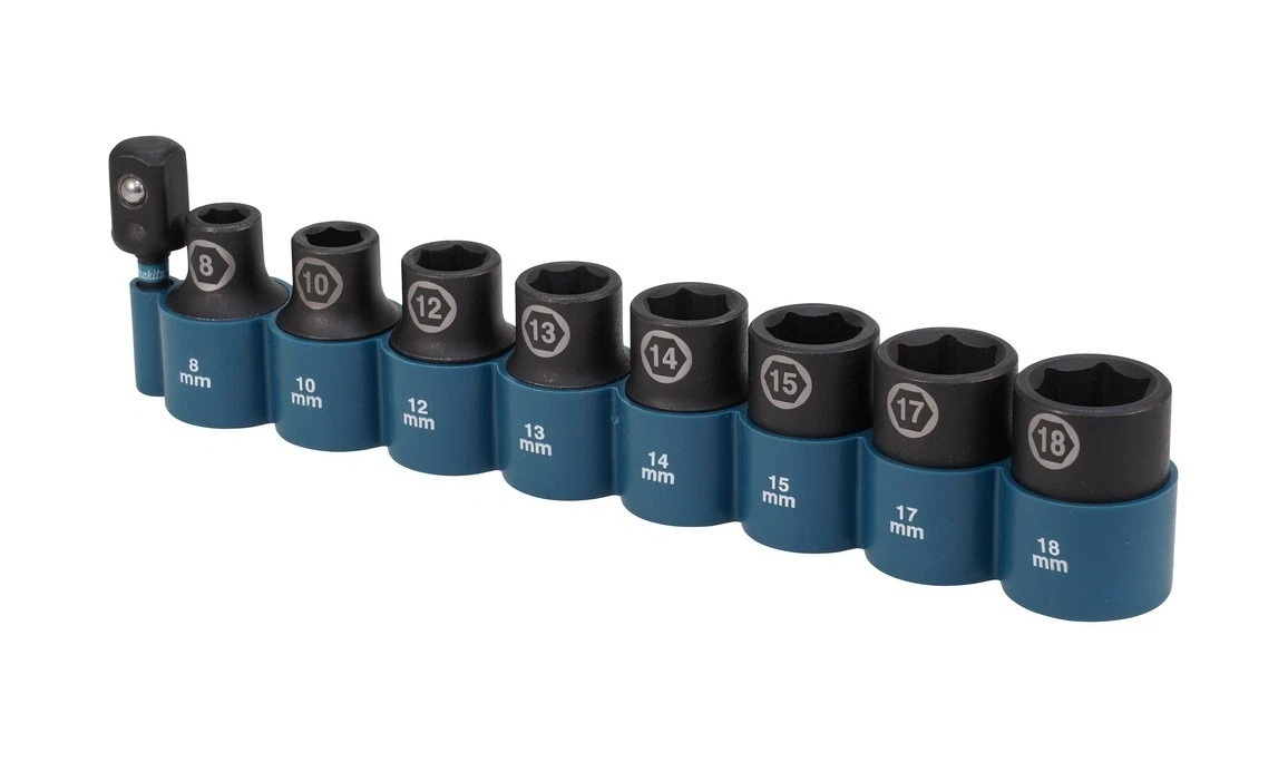9 Piece Impact Black Impact Socket Set. 1/2" in sizes 8, 10,12, 13, 14, 15, 17 & 18mm. Includes an impact socket adapter