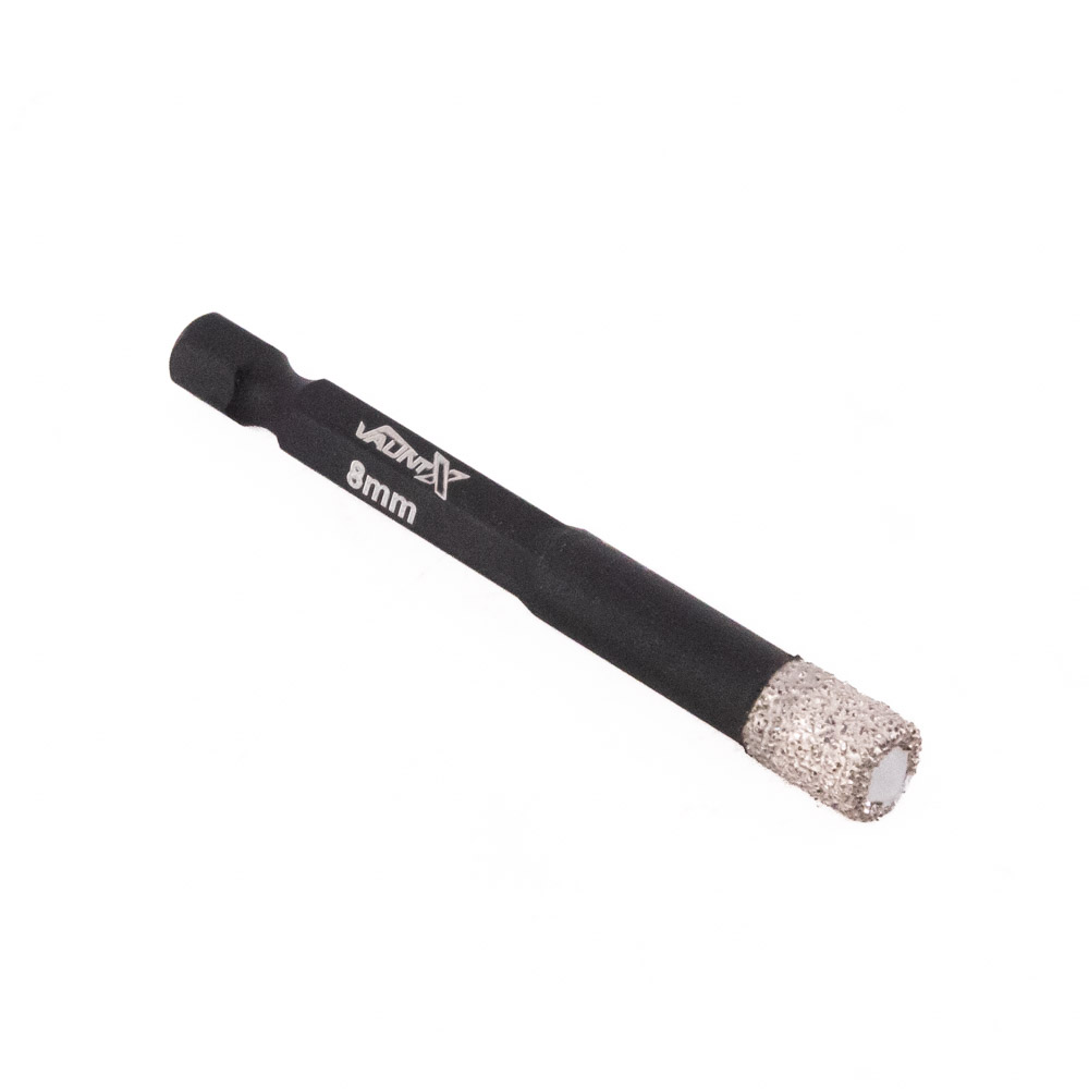 The Vaunt Vacuum brazed diamond drills are premium quality bits that are perfect for drilling precise & clean holes in marble, masonry, concrete, porcelain, ceramic and glass. The vacuum brazing technology creates a far stronger bond for the diamond coating, allowing for increased durability and longevity. The wax filled centres allow the bits to self-cool, protecting the material and prolonging bit life. These truly are a premium quality drill bit ., Diamond coating with vacuum brazed technology, 1 x 8mm Diamond drill bit