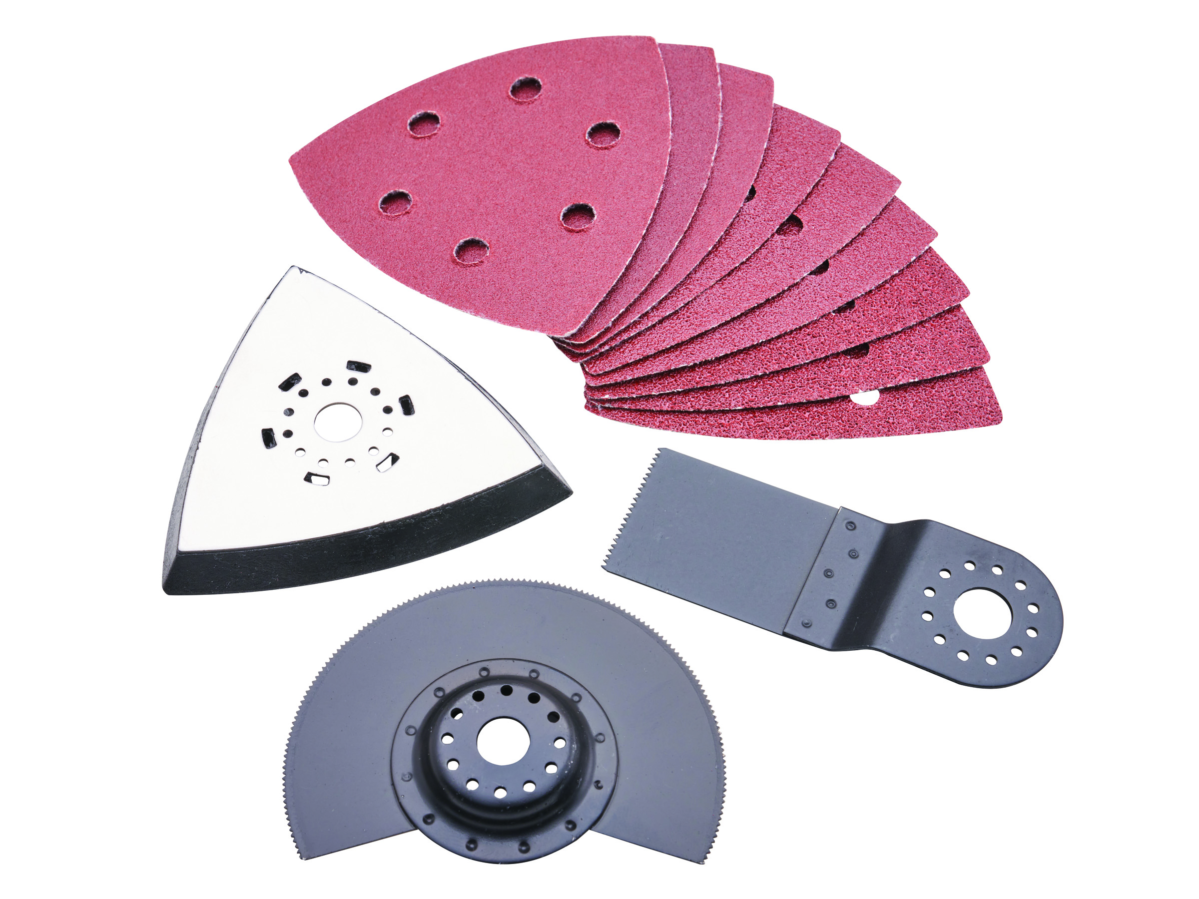Includes several accessories including sandpaper x 9 for wood & metal (3 x each P60, P80, P120), scraper, plunge-cut saw blade for wood and plastic, segment saw blade for wood, plastic and soft metal (HSS).