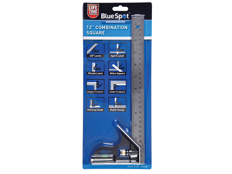 The BlueSpot Combination Square is specially designed for use in wood and metalworking. Features a hardened and tempered blade for extra durability with metric and imperial graduations. Spirit level and scriber included in square head handle. Locating screws on all heads ensure quick and easy assembly.
