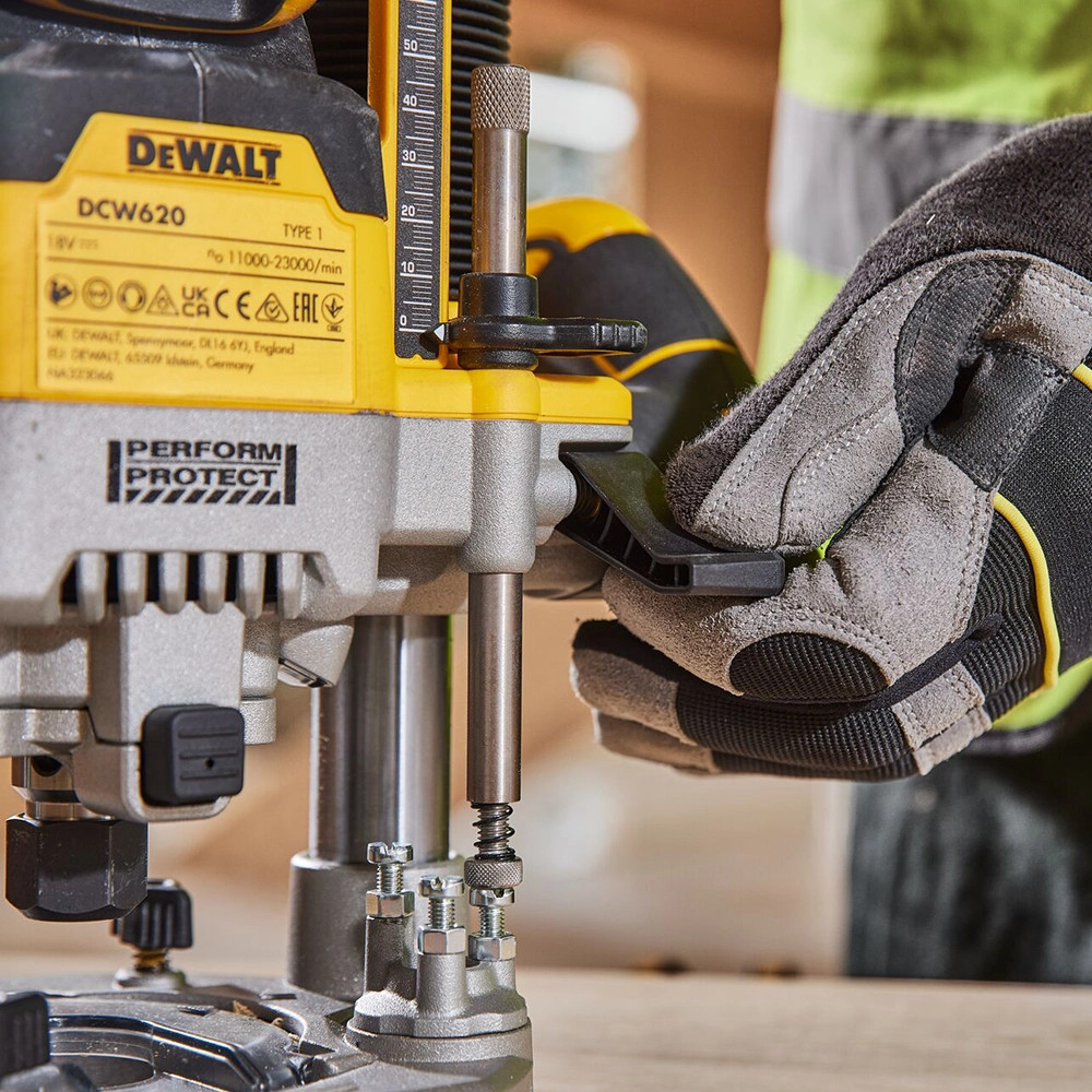 Compatible with common guide bushes, the DCW620H2 router includes both a plunge lock lever for applying force as well as trigger depth lock to reduce downward force during depth lock operation.