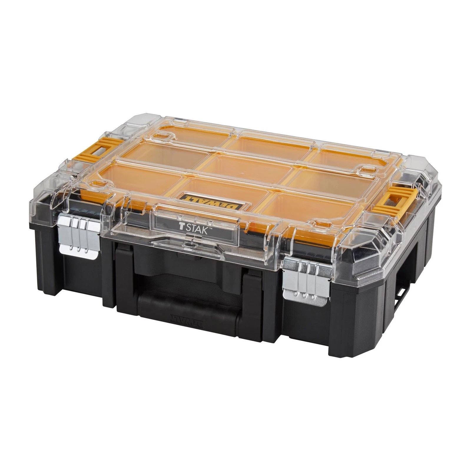 1 x TSTAK V Clear Lid Organiser with 2 large and 5 small removable storage cups for storing small parts and accessories. Its unique, heavy-duty lid design locks all compartments in place for secure storage. A built-in wide handle allows easy and stable portability, whilst the clear and impact resistant lid allows full visibility for quick access.