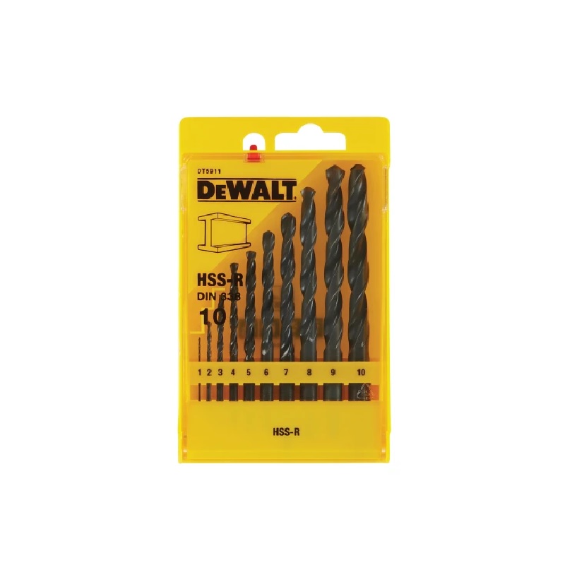 The DEWALT DT5911 HSS-R Jobber Drill Bit Set is supplied in a plastic carry case, with the following sizes: 1, 2, 3, 4, 5, 6, 7, 8, 9, 10mm.