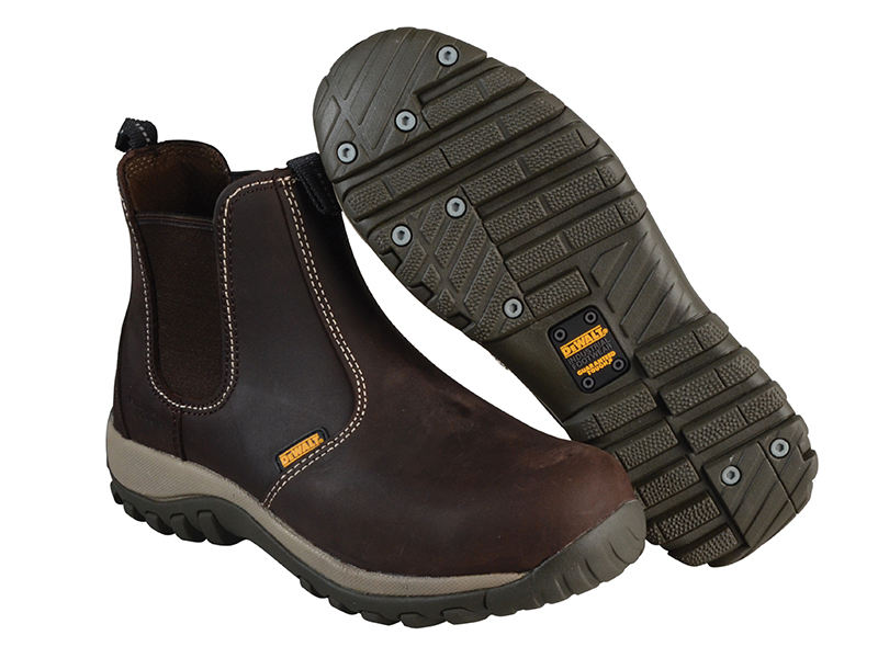 The DEWALT Radial Safety Brown Boots have a full grain, distressed brown (Crazy Horse), waxy leather upper. With elasticated sides and 2 woven pull loops to the front and rear for easy putting on/removal. They are fitted with a steel toecap that has been
