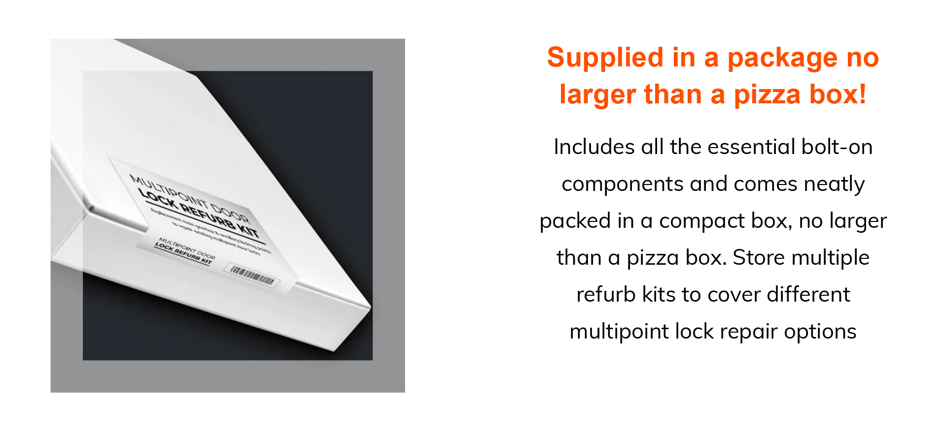 These kits offer a convenient way to repair and recommission failed multipoint door lock mechanisms, in a package no larger than a pizza box!