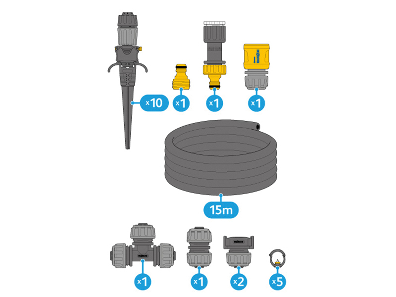 The Hozelock Universal Kit is a complete watering kit for an area up to 10m². It allows easy watering of borders, hedges, and vegetable gardens to save time, effort, and water.