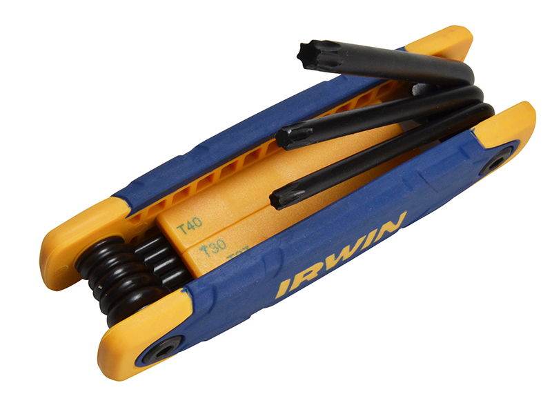 The Irwin TORX Key Folding Set consists of 8 retractable TORX keys, housed in a high-resistance, polyamide and fibreglass handle. The ergonomic rubber grip ensures great comfort and ease of use. The keys are manufactured from black oxide chrome vanadium steel for strength and durability.