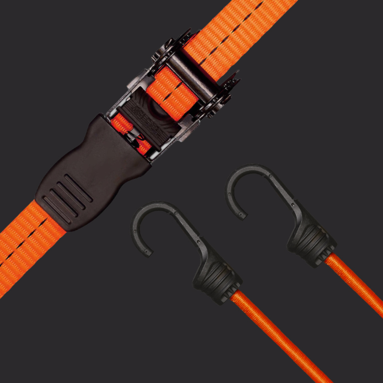 Kit Contents: 2x 4M Light Duty Ratchet Straps, 2x 100cm Bungee Cords, 2x 80cm Bungee Cords, 2x 60cm Bungee Cords