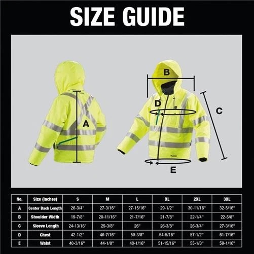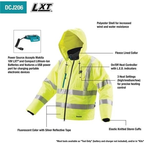 The Makita DCJ206Z 18 14.4v LXT Hi Viz Heated Jacket is made from high visibility fluorescent yellow polyester with reflective silver lines in accordance with many standards (ISO20471, ANSI107, JIS T 8127, CAN/CSA Z96-09, AS/NZS 4602.1:2011).