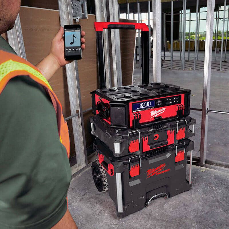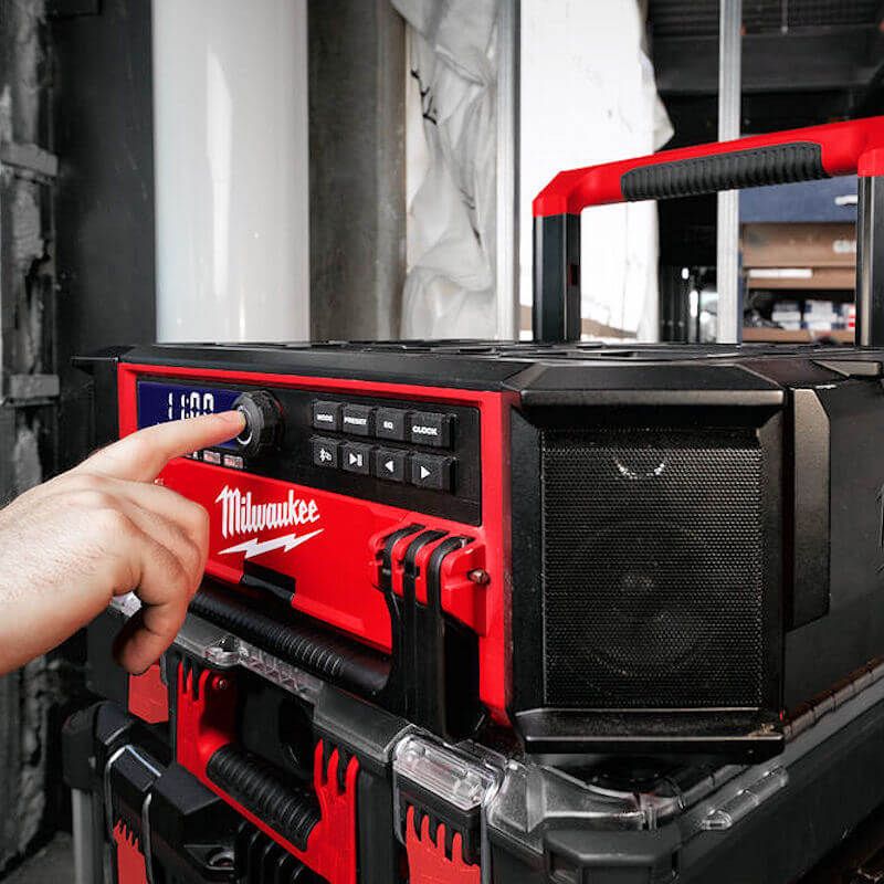 The Milwaukee M18PRCDAB+ DAB+ Radio and Charger features premium surround sound speakers with a 40W amplifier. Compatible with any Milwaukee Packout system item.