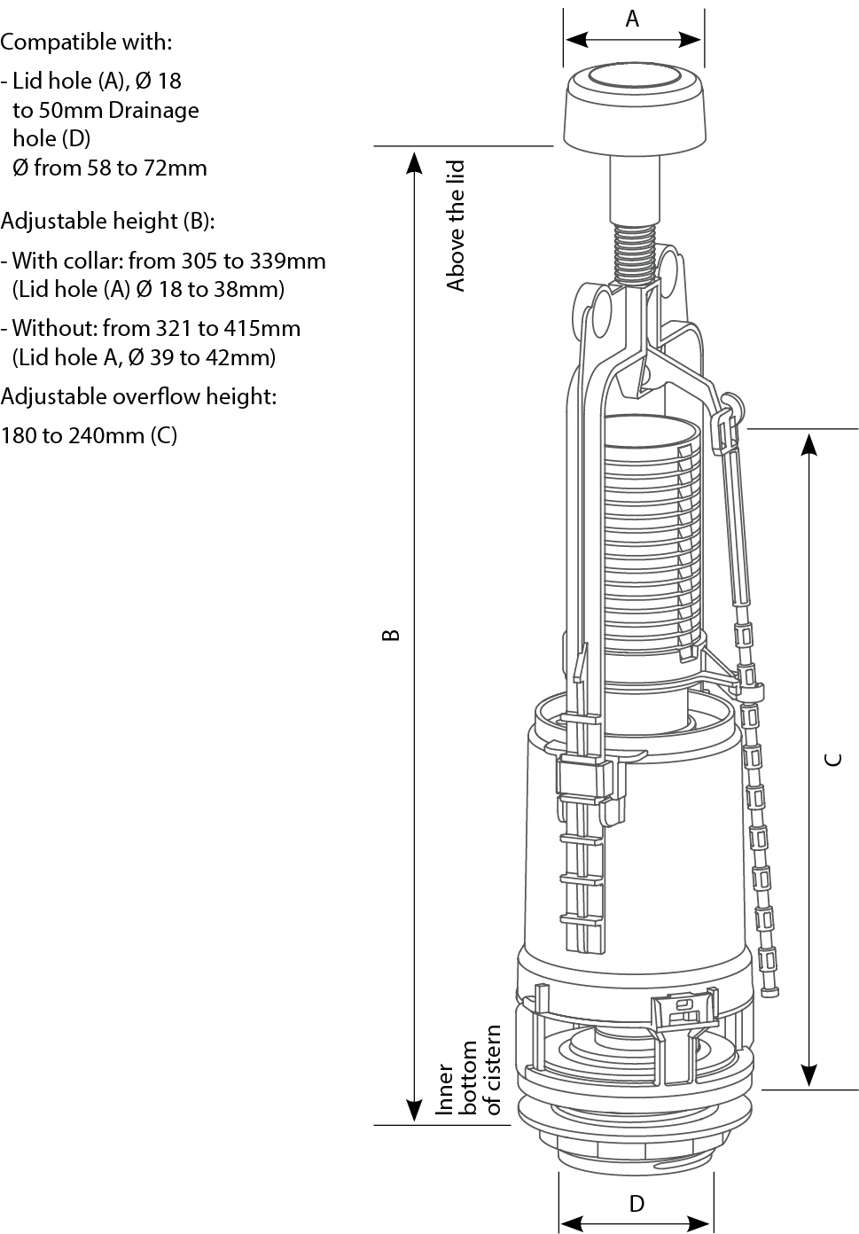 Can be installed into plastic or ceramic cisterns