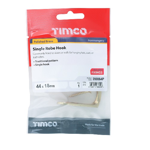 Timco 44 x 18mm - Single Robe Hook - Polished Brass - TIMpac of 1
