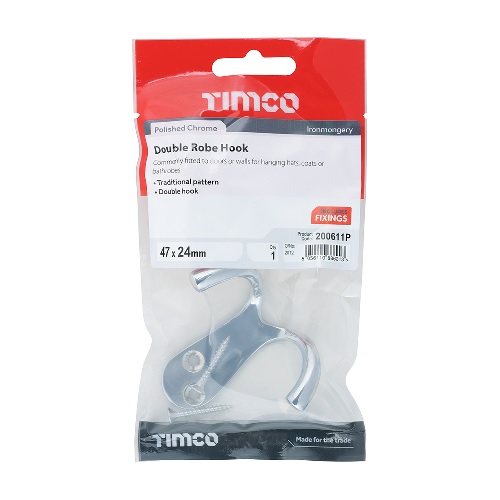 Timco 47 x 24mm - Double Robe Hook - Polished Chrome - TIMpac of 1