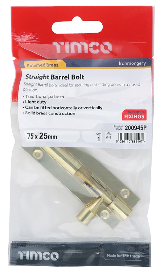 Timco Straight Barrel Bolt - Polished Brass