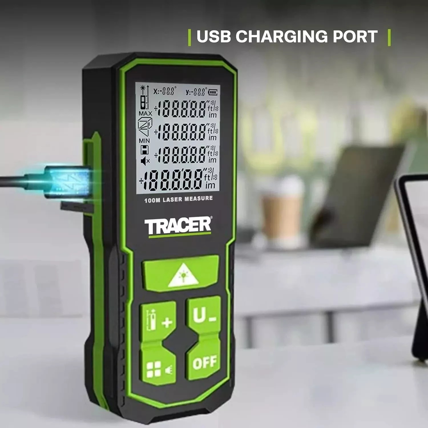 Tracer Green Rechargeable 100m Laser Distance Measure, USB Lead & Batteries.