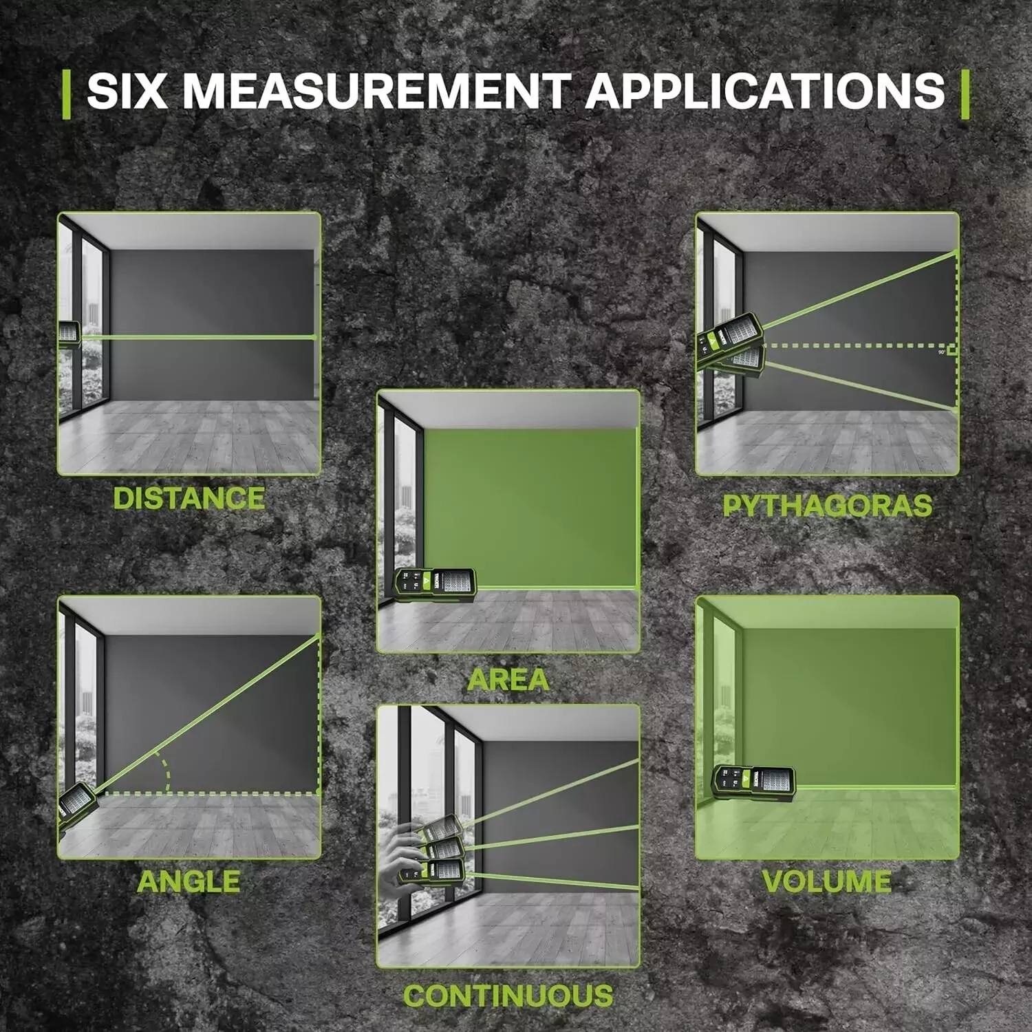 100m (328FT) LASER DISTANCE MEASURER: Using a High-visibility Green Laser Beam, precisely measure distances up to 100m (328ft) in length in either Metric or Imperial scales