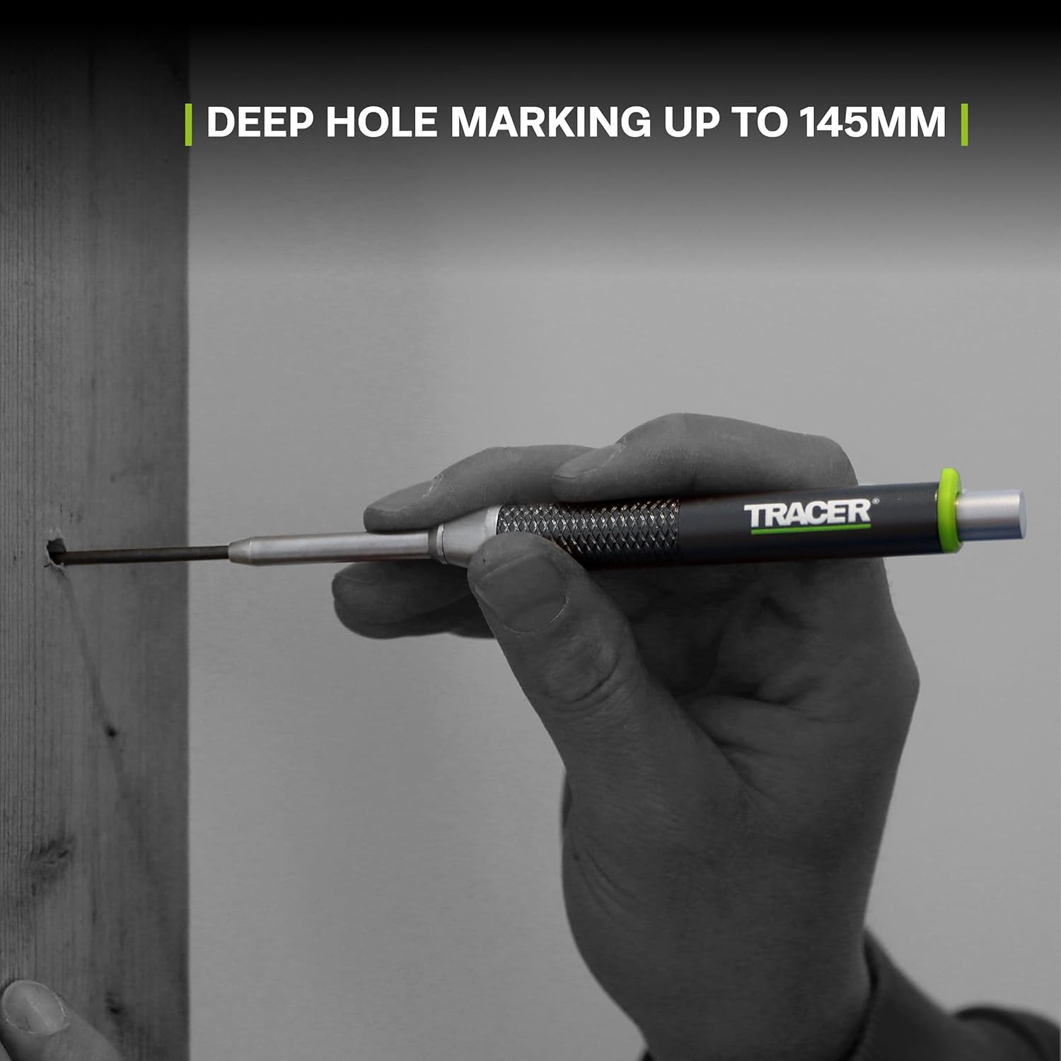 DEEP HOLE CONSTRUCTION PENCIL & REPLACEMENT LEADS: The TRACER Carpenter's Pencil gives clear and precise marking up to 145mm and is also ideal for general-purpose construction marking on most common materials. Comes with an Inbuilt Sharpener, Holster and replacement lead set in an anti-snap dispenser.
