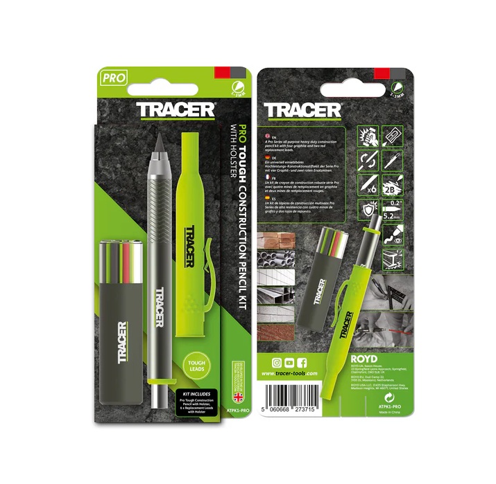 TRACER Pro Series Tough Construction Pencil Kit complete with 4x Replacement Leads and 2x Alternative Leads. Designed to be the toughest pencil in your toolkit, it is the ultimate answer to your marking needs on the jobsite. The TRACER Pro Series represen