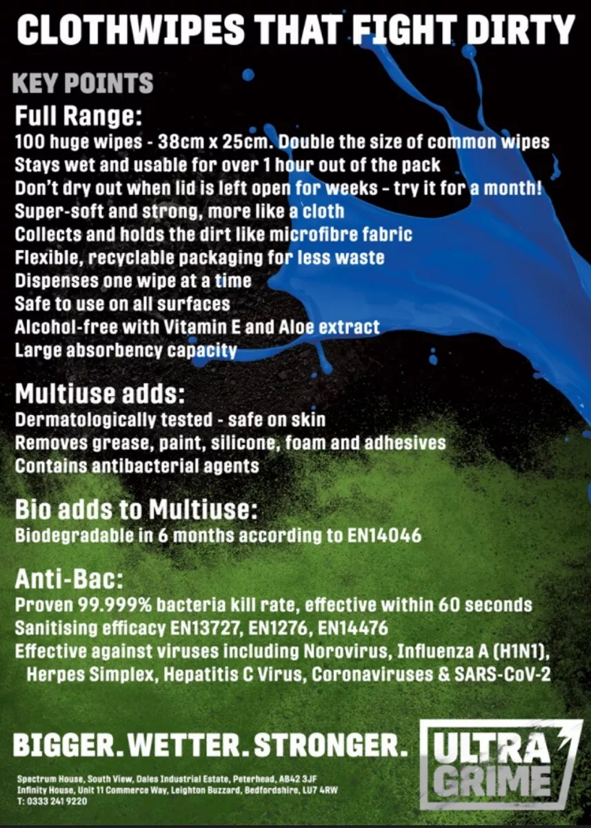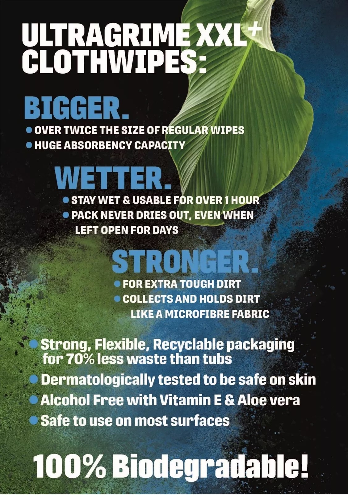 SPECIFICATIONSBIGGER, WETTER, STRONGER100 XXL+ 100% Biodegradable ClothwipesBigger at a massive 38cm x 25 cmSuper strong & Soft cloth like fabric.Stays wet and useable for over an hourDont dry out when lid is left open for days try it for a week