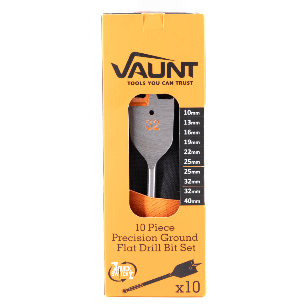 The Vaunt Flat Bits are designed to offer excellent performance, increased durability and good value for money! Made from fully hardened, precision ground carbon steel point and shoulders give a superior clean cut The orange ground chip breaker reduces splintering for cleaner holes and improved drilling efficiency, it also helps to break up and remove waste debris material, reduces heat build-up which in turn increases the speed of the drill, durability and the bits lifespan.