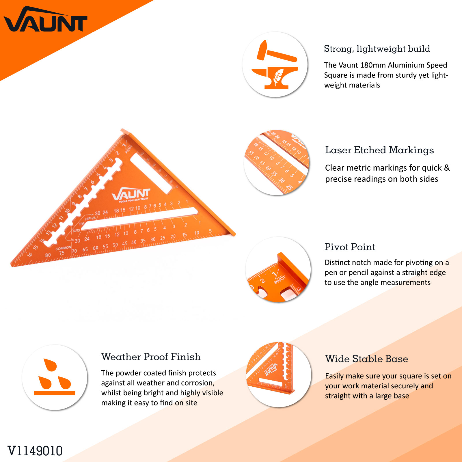 Heavy duty speed square made from extra thick aluminium for superior strength, yet incredibly lightweight. Ideal for quick and accurate measurement readings, with ultra clear laser etched markings and bright powder coating for easy visibility and rust prevention The Vaunt roofing square is complete with common, hip and valley measurements & protractor functionality. Use as a protractor, try square, mitre square, framing square or just for quick and easy 90 degree and 45 degree angles., Professional speed square,