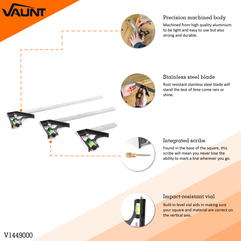 The Vaunt Combination Square Set represents incredible value for money, the set includes the 150mm, 300mm and the 450mm so you have a square no matter how big or small the job is. Made to exacting, high quality standards, each rule has been precision machined to offer the pinnacle in accuracy. The blade is made from stainless steel to withstand the rigours of working on site, while each one has been treated to be resistant to rust. The rule has been scribed with your measuring points and includes a hihly visible, impact resistant vial., Precision machined body,