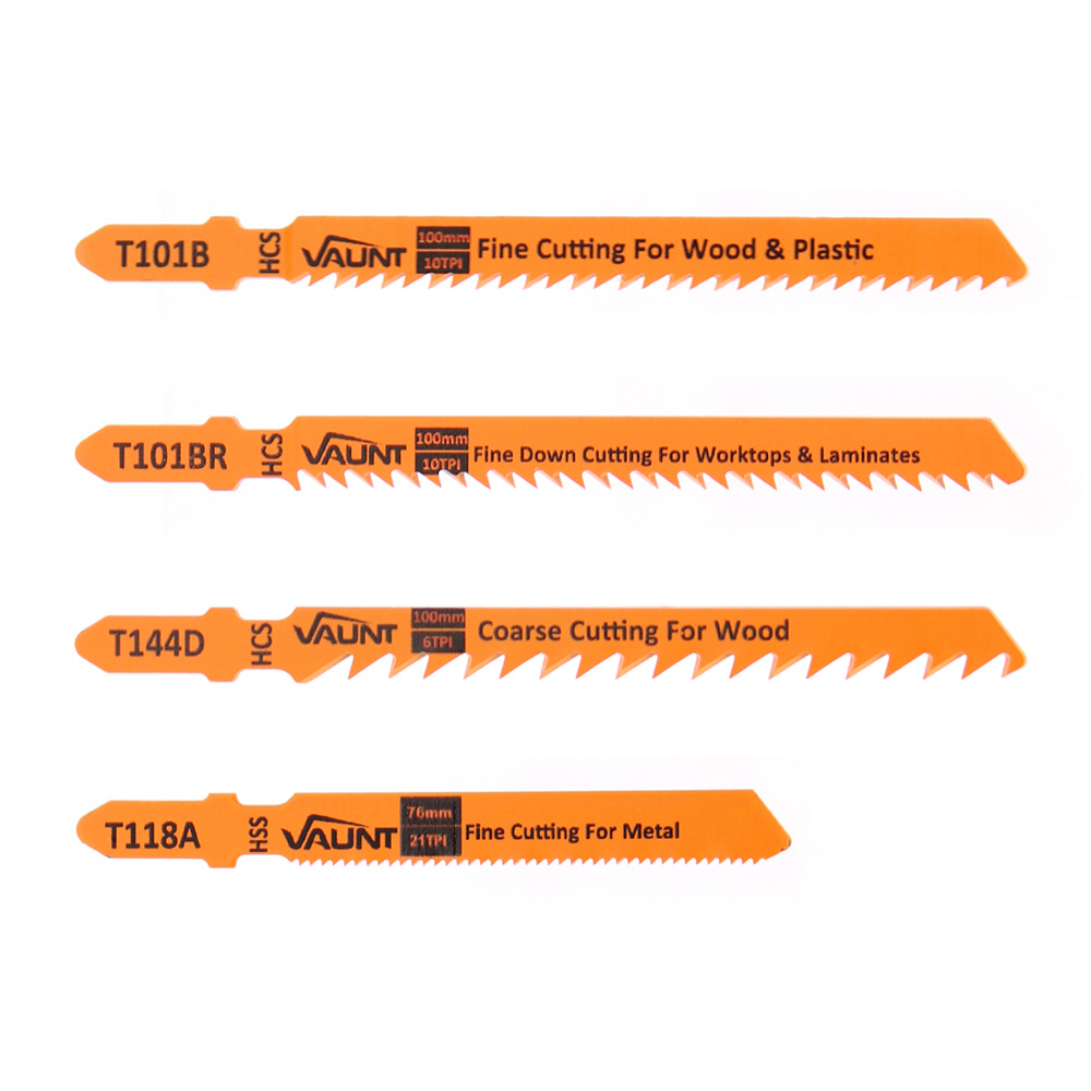 The Vaunt Mixed Jigsaw Blades is a versatile selection of various Vaunt blades delivering differing results in cutting. The T-Shank blades offer compatibility with almost all jigsaws from the leading brands. The Vaunt Coarse Wood Cutting (T144D) Jigsaw Blades is a set of versatile blades that are ideally suited for dealing softwood, chipboard and plastics. These incredibly durable blades deliver an exceptional quality of fast, coarse cutting results. Product Length: 100mm Max Cutting Capacity: 50mm Finish: Coarse/Fast Suitable For: Soft Wood, Chipboard, Fibre, Plywood, Plastics Teeth Per Inch:6 The Vaunt Clean Wood Cutting (T101B) Jigsaw Blades is a set of versatile blades that are ideally suited for dealing softwood, chipboard, plastics and more. The sharp- ground teeth with taper-ground body enable spotless results. The steel blades are appropriate for cutting softwood and non-abrasive woodworking materials. Product Length: 100mm Max Cutting Capacity: 30mm Finish: Fine Suitable For: Laminates, Wood, Plastics Teeth Per Inch: 10 The Vaunt Down Wood Cutting (T101BR) Jigsaw Blades is a set of versatile blades that are ideally suited for dealing softwood and laminated panels. The reverse tooth design cuts tear-free at the top surface and is ideal for kitchen installers and furniture builders. Product Length: 100mm Max Cutting Capacity: 30mm Finish: Fine and Down Suitable For: Wood, Laminate, Plastics Teeth Per Inch: 10 The Vaunt Metal Cutting (T118A) Jigsaw Blades is a set of versatile blades that are ideally suited for dealing aluminium, non-ferrous metals and thin steel. The milled, wavy-set teeth are ideal for straight cuts without special requirements. These incredibly durable blades deliver an exceptional quality of clean cutting results. Product Length: 76mm Max Cutting Capacity: 3mm Finish: Fine Suitable For: Thin Steel, Aluminium, Non Ferrous Metals Teeth Per Inch: 21, Professional quality, 5x Vaunt Coarse Wood Cutting (T144D) Jigsaw Blades 10x Vaunt Clean Wood Cutting (T101B) Jigsaw Blades 5x Vaunt Down Wood Cutting (T101BR) Jigsaw Blades 10x Vaunt Metal Cutting (T118A) Jigsaw Blades