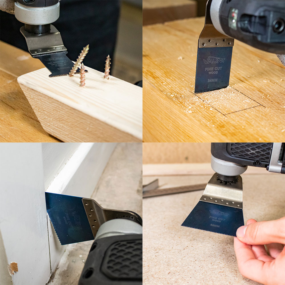 The Vaunt Premium Assorted Multi Tool Blade Pack provides 8 of the most essential blades for any situation. The Vaunt Premium 34mm and 68mm Japanese Tooth Multi Tool Blades and are designed with speed, accuracy, quality, and durability. With double set Japanese teeth, the blade offers a rapid and aggressive cut that retains a superior level of precision and accuracy. These blades are suitable for wood, timber overlay flooring and plastics including bamboo and create a coarse cut finish. The Vaunt Premium 34mm Fine Finish Multi Tool Blades are designed for quality and durability. These blades offer a finer cut than most multi tool blades with a single row of fine teeth allowing for more precision use and a neater finish. A blue oxide finish is added to prevent rust. These blades are suitable for most woods and plastics. The Vaunt Premium 34mm Bi-Metal Multi Tool Blades are designed for flexibility with Strength and durability. A row of high-speed steel teeth are welded to a spring steel body to create a fine cut finish but with the strength of HSS teeth to cut through those tougher materials. They are coated with a blue oxide finish that prevents rust, to keep them in the best working condition until finished with. These blades are ideal for hard and soft woods, wood with embedded nails, plastic, fibreglass, and nonferrous metals, measuring 34mm wide with a 50mm cut depth there a great allrounder and a much need staple to any tool kit. Designed with a universal fitting system these multitool blades are compatible with Fein, Bosch, Makita, DeWalt and many more! , Pack includes Fine Cut, Bi-Metal & Japanese tooth blades, 1x Vaunt Premium 34mm Bi-Metal Multi Tool Blades 1x Vaunt Premium 44mm Bi-Metal Multi Tool Blades 1x Vaunt Premium 34mm Fine Finish Multi Tool Blade 1x Vaunt Premium 68mm Fine Finish Multi Tool Blade 2x Vaunt Premium 34mm Japanese Tooth Multi Tool Blade 2x Vaunt Premium 68mm Japanese Tooth Multi Tool Blade