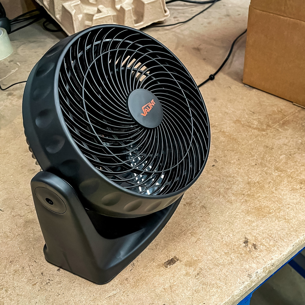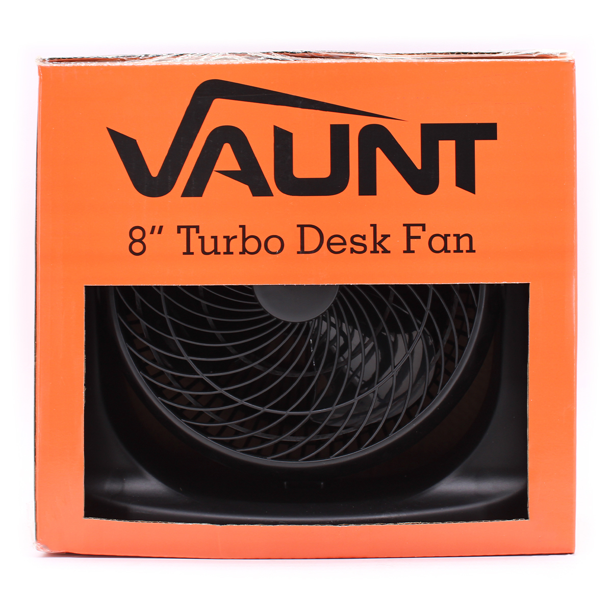 The Vaunt 8 Turbo desk fan packs a punch for a small fan, with 3 speed settings, Oscillate, tilt function and a 20w motor this compact fan will keep you cool this summer., 3 guarded blades, 1 x Vaunt 8in Turbo Desk Fan