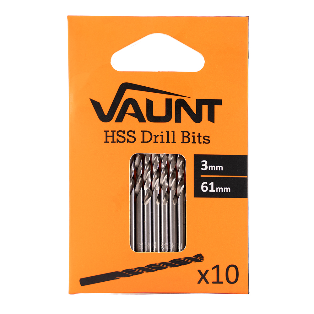 The Vaunt HSS drill bits are ideal for drilling wood, metal and plastics, the ground forged process produces a high-quality bit with good overall life, Suitable for - Wood, metals & plastics, 10 x Vaunt HSS Drill Bit 3mm x 61mm