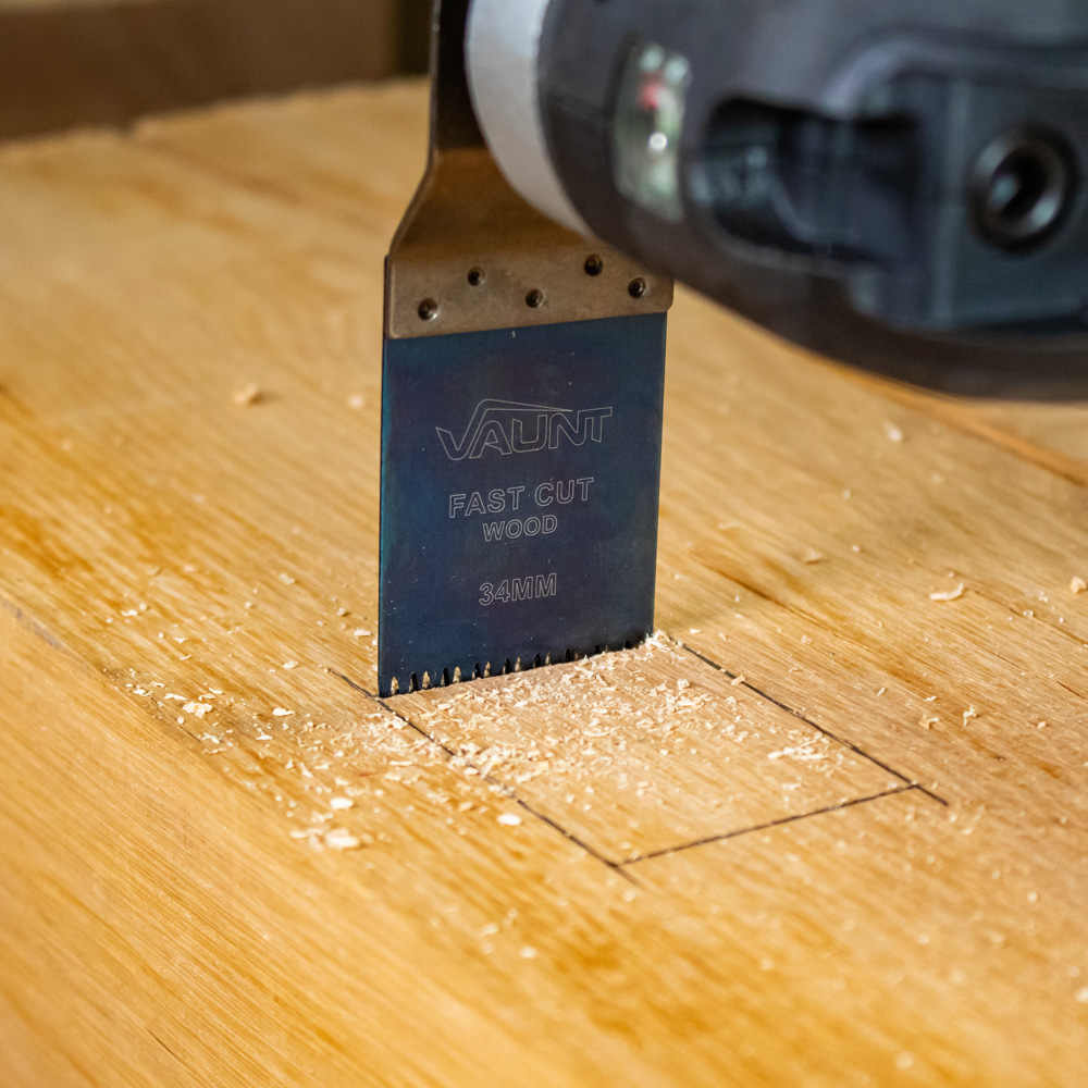 The Vaunt Premium 34mm Japanese Tooth Multi Tool Blades are designed with speed, accuracy, quality, and durability. With double set Japanese teeth, the blade offers a rapid and aggressive cut that retains a superior level of precision and accuracy. Measuring 34mm wide with a 40mm cut depth, these blades are suitable for wood, timber overlay flooring and plastics including bamboo and create a course cut finish. Designed with a universal fitting system these multitool blades are compatible with Fein, Bosch, Makita, DeWalt and many more!, Ideal for Wood, flooring and plastics, 3x Vaunt Premium 34mm Japanese Tooth Multi Tool Blades