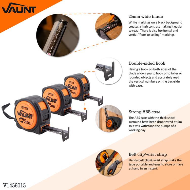 The Vaunt premium 5m heavy duty contractor grade tape has been built to last! The thick rubber surround provides efficient shock absorbtion allowing the tape to survive a 5m drop! The 25mm wide black diamond coated, high strength carbon steel blade offers high precision calibrated measuring (computer controlled to make the printing clearer and more precise) with a durable nylon coating to ensure high abrasion resistance that is rust proof. Featuring white markings on black background creates a high contrast, making it easier to read, displaying clear horizontal readings on the front of the tape, but also a vertical ceiling to floor reading printed on the back of the blade, which allows for easy viewing when measuring from the ceiling downwards. With an impressive 2.6m standout, the heavy duty compact tape measure includes a durable metal hook on the blade end, which features a top hook that allows you to hook the tape and view the back of the tape to use the top down vertical measurements. The ABS case and internal metal axis mechanism have been drop tested at 5m so will withstands the bumps of a working day on site, and features a handy belt clip and wrist strap for easy storage. , 5m metric tape measure with Class 2 accuracy rating, 3x Heavy Duty Tape Measures