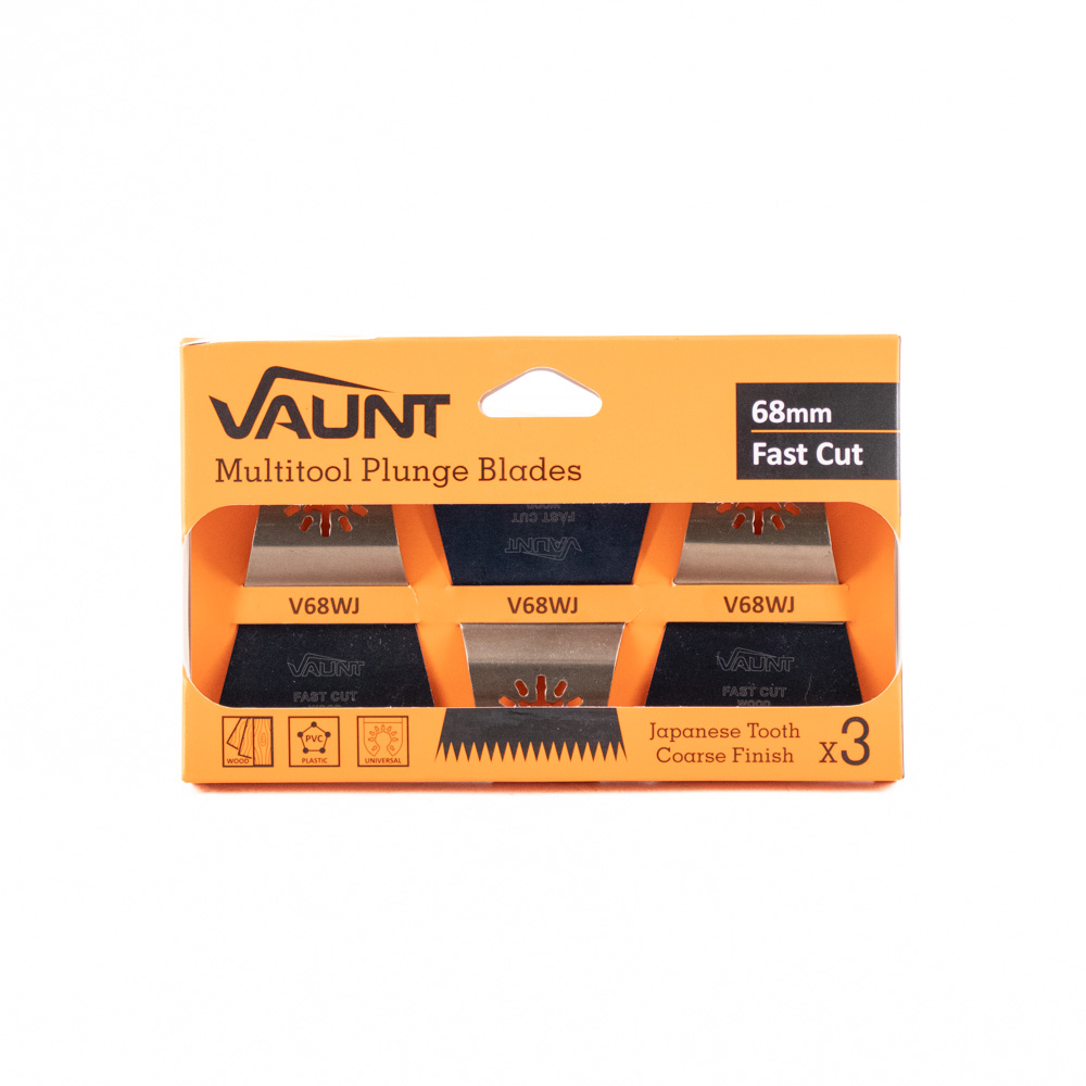 The Vaunt Premium 68mm Japanese Tooth Multi Tool Blades are designed with speed, accuracy, quality, and durability. With double set Japanese teeth, the blade offers a rapid and aggressive cut that retains a superior level of precision and accuracy. Measuring 68mm wide with a 40mm cut depth, these blades are suitable for wood, timber overlay flooring and plastics including bamboo and create a coarse cut finish. Designed with a universal fitting system these multitool blades are compatible with Fein, Bosch, Makita, DeWalt and many more!, Perfect for Wood, flooring and plastics, 3x Vaunt Premium 68mm Japanese Tooth Multi Tool Blades