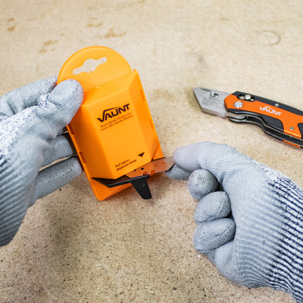 This pack of 100 Vaunt heavy-duty utility knife blades come in a handy dispenser. The blades are hardened and tempered for sharpness and long-life and are ideal for general heavy-duty cutting as well as carpets and vinyl. Fits most standard utility knives, Heavy-duty, general-purpose blades, 100x Vaunt Utility Knife Blades