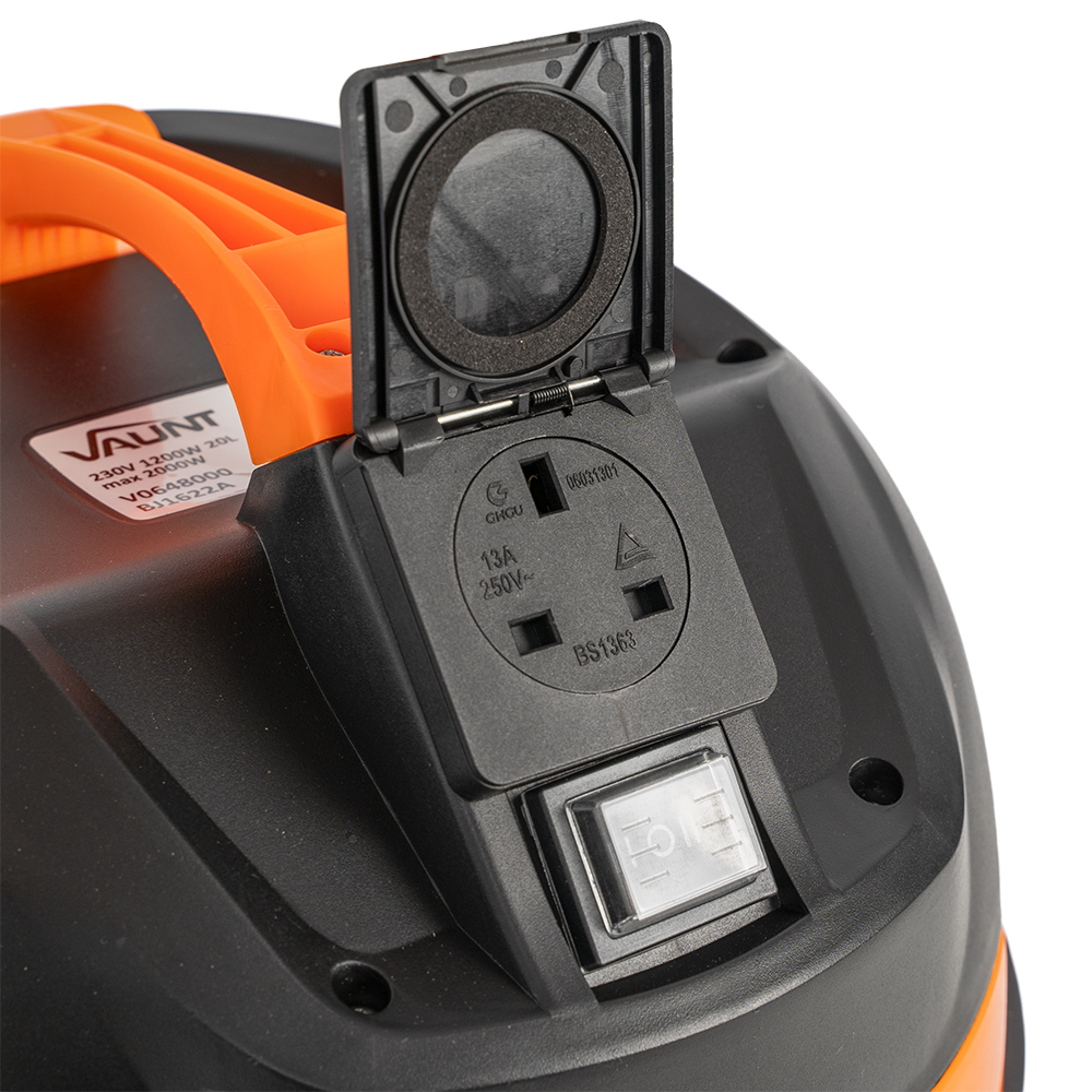 The Vaunt 240V Wet and Dry Vacuum Cleaner is ideal for tradesman and DIY users alike. The quiet 76db 1200W full copper motor delivers ample suction power and convenient blowing, combined with the 20-litre stainless steel barrel, gives the user plenty of compartment space before having to empty. The H13 HEPA filter working together with the cotton filter offers a high particle filter capture to limit the exposure to harmful dust. The filter tap allows you to manually tap the filter with a lever outside the unit, to keep the filter clear and maintain the suction efficiency without having to open the drum (very important). Designed with a power take off socket for connection with your power tools (up to 2000W) the vacuum and blower can be turned on using your power tool alone creating a safe and additional tool free environment. The unit features a long 7.5m cable, a heavy duty 1.5m hose and a stable wheelbase that has castors to for easy manoeuvrability. Accessory storage and cable tidy also included. This really is a high specification vacuum cleaner in a small form factor, perfect for the back of the van or for quick spills in the home or workshop., Wet and Dry 20L capacity tank, 1x Extractor Body 1x 1.5m Hose Assembly, 1x Metal telescopic tube, 1x Advanced floor brush 1x Crevice nozzle 1x Round brush, 1x H13 Hepa filter 1x Cotton filter