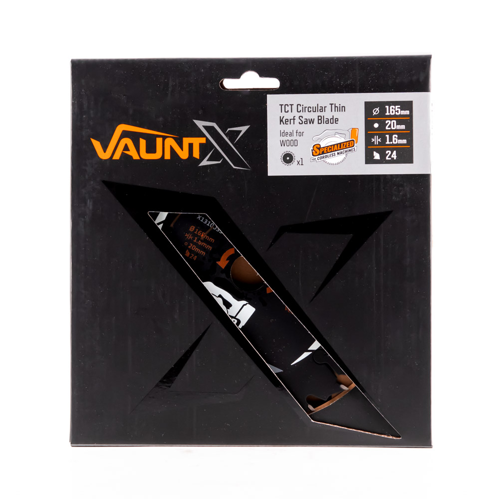 The Vaunt X premium thin kerf blade has been manufactured with a thinner plate and smaller teeth to provide a cleaner, more precise cut with less friction, ideal for use on softwood, hardwood and plastics! These blades are perfect for use on cordless tools as the less friction created, the more cuts you will get per charge. Only high-quality materials and the latest manufacturing techniques are used on these premium blades, Cleaner, more precise cut, 1 x Vaunt TCT Circular Saw Blade 165mm x 20mm 24T