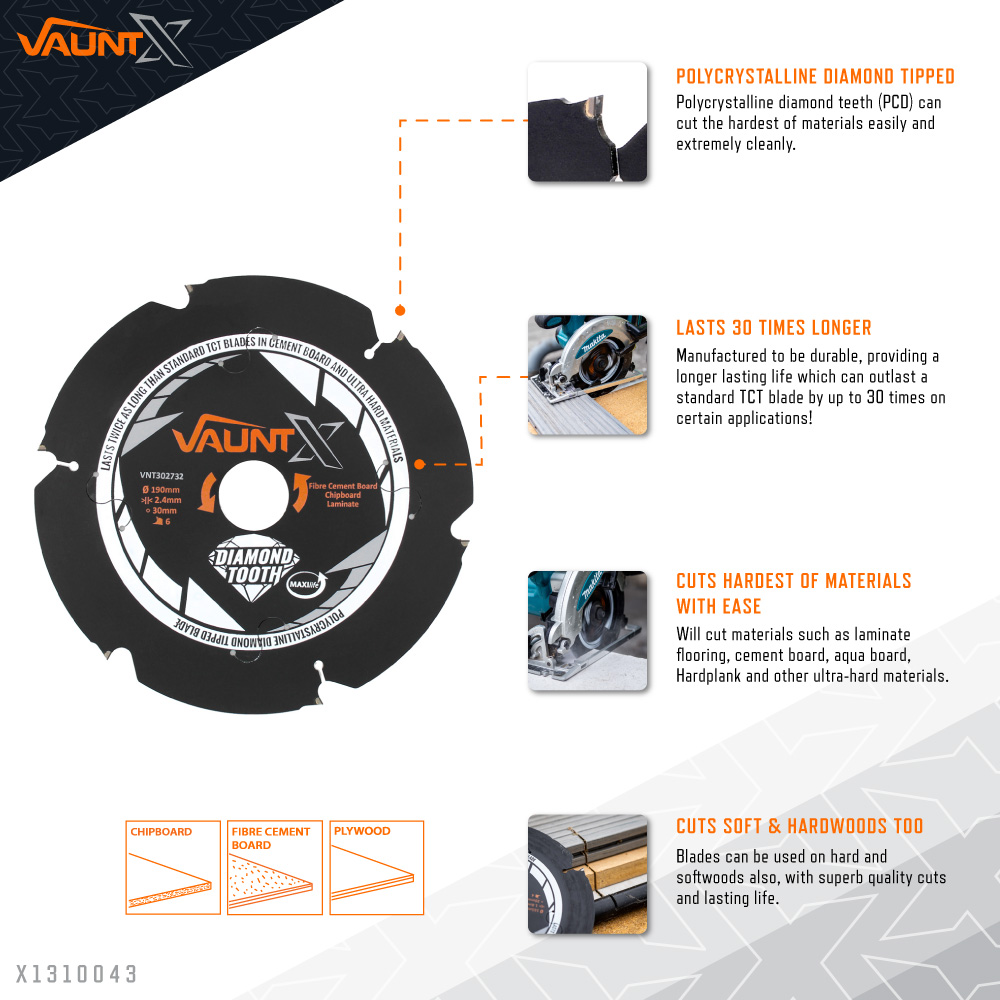 Vaunt X 190mm x 30mm 6 Diamond Teeth PCD Circular Saw Blade