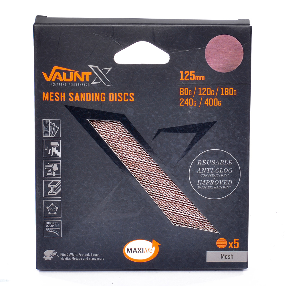 The Vaunt X Mesh Net Sanding Discs are made from extra tough and durable sanding mesh and are the cost-effective solution for the most demanding of sanding jobs. Designed with an anti-clog open net structure, these sanding discs allow for almost dust-free sanding when used with an extractor, for increased productivity and longevity. The discs provide exceptionally high performance and superior material removal and also provide a cost-effective solution as they can be rinsed and reused (air dry thoroughly before reusing). Suitable for all 125mm Random Orbital Sanders, the Vaunt X Mesh Net Discs are suitable for use on wood, paint, plaster, metal and plastic, and the hook & loop backing allows for quick and straightforward attachment., Assorted Grit, 1x Vaunt X 125mm 80 Grit Mesh Net Sanding Discs 1x Vaunt X 125mm 120 Grit Mesh Net Sanding Discs 1x Vaunt X 125mm 180 Grit Mesh Net Sanding Discs 1x Vaunt X 125mm 240 Grit Mesh Net Sanding Discs 1x Vaunt X 125mm 400 Grit Mesh Net Sanding Discs