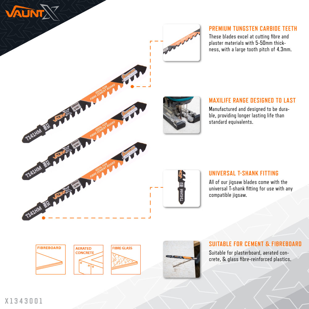 The Vaunt X Cement/Fibreboard Cutting (T141HM) Jigsaw Blades is a specialist set of jigsaw blades that are ideal for working with fibre and plasterboards. The premium quality, TCT blades, with large, constant tooth pitch are perfect for dealing with thick and tough materials up to 50mm including plasterboard, aerated concrete, and glass fibre-reinforced plastics. The Vaunt X Blades offer long life durability and exceptional cutting capabilities. They have been designed to make repeated cuts in the most abrasive materials. It's the best choice for professionals needing to tackle a tough job like drywall installation. The T-Shank blades offer compatibility with almost all jigsaws from the leading brands., Suitable for - Plasterboard, aerated concrete, & glass fibre-reinforced plastics, 3x Vaunt X Cement/Fibreboard Cutting (T141HM) Jigsaw Blades